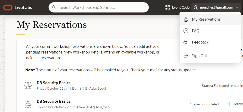 승인이 되면 My Reservations 을 클릭하여 실습환경에 접속한다.
