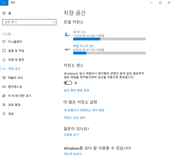1. 시작메뉴 - Windows 설정 - 시스템 - 저장공간 - 저장공간 C 드라이브 선택
