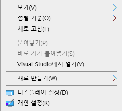 윈도우 10 에서 바탕화면에 마우스 오른쪽 버튼을 클릭하면 텍스트 메뉴창이 나타나는게 정상입니다.