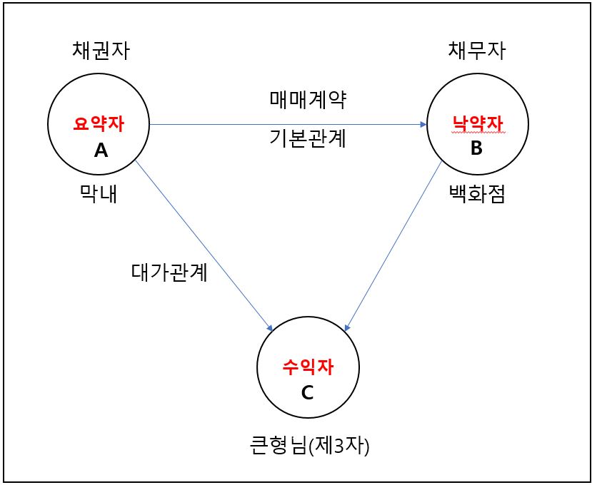 ① 계약에 의하여 당사자 일방이 제삼자(C)에게 이행할 것을 약정한 때에는 그 제삼자(C)는 채무자(B)에게 직접 그 이행을 청구할 수 있다.