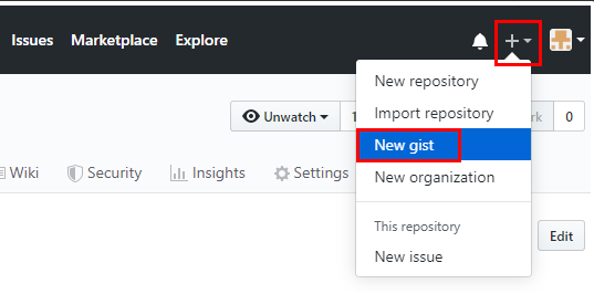 2. 깃허브에서 (+) 버튼(오른쪽 상단)을 클릭하고 New gist 를 선택한다.