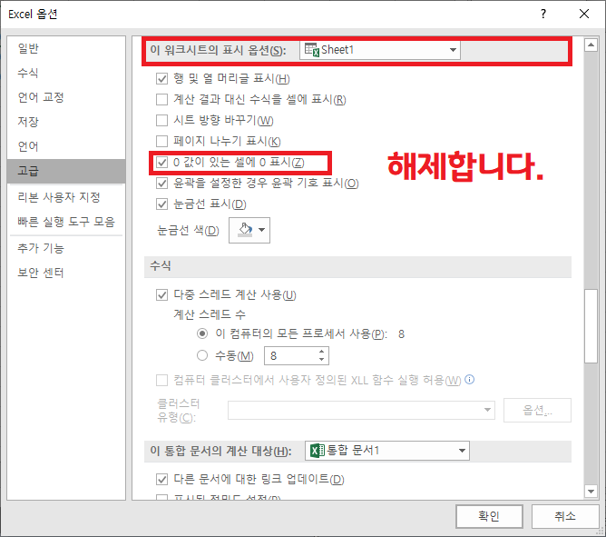 방법 2. 파일 - 옵션 - 고급 - 0값이 있는 셀에 0 표시(Z) 체크를 해제한다.